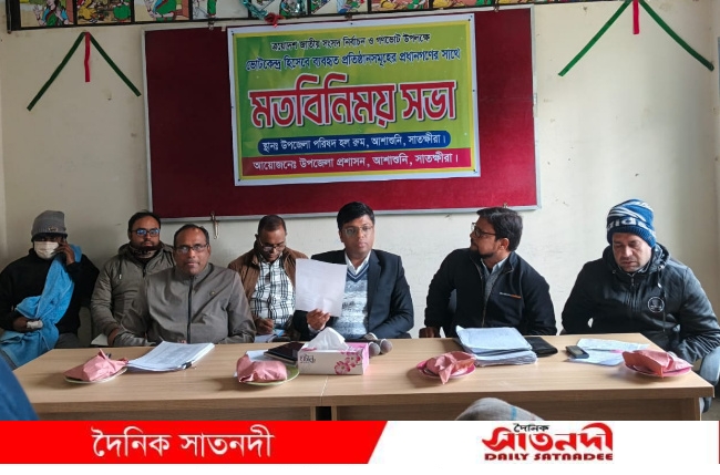 জি এম মুজিবুর রহমান, আশাশুনি (সাতক্ষীরা) ঃ আশাশুনিতে ত্রয়োদশ জাতীয় সংসদ নির্বাচন ও গণভোট উপলক্ষে ভোট কেন্দ্র হিসাবে ব্যবহৃত প্রতিষ্ঠান সমূহের প্রধানগণের সাথে মতবিনিময় সভা অনুষ্ঠিত হয়েছে। সোমবার (৫ জানুয়ারী) বিকাল ৪ টায় উপজেলা পরিষদ সম্মেলন কক্ষে এ মতবিনিময় সভা অনুষ্ঠিত হয়।