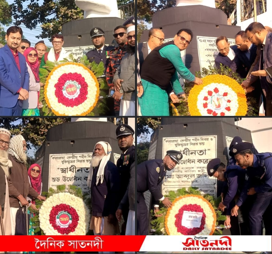কামরুল হাসান।। কলারোয়ায় যথাযোগ্য মর্যাদায় মহান বিজয় দিবস-২০২৫ উদযাপন করা হয়েছে। উপজেলা প্রশাসনের পক্ষ থেকে নানা কর্মসূচির মধ্য দিয়ে দিবসটি উদযাপন করা হয়। কর্মসূচির মধ্যে ছিল মঙ্গলবার (১৬ ডিসেম্বর) প্রত্যুষে একত্রিশবার তোপধ্বনির মাধ্যমে দিবসের শুভ সূচনা। সূর্যোদয়ের সাথে সাথে সকল সরকারি, আধা-সরকারি, স্বায়ত্বশাসিত এবং বেসরকারি ভবনে জাতীয় পতাকা উত্তোলন। সকাল সাড়ে ৮ টায় শহীদ বীর মুক্তিযোদ্ধাদের স্মরণে পুষ্পমাল্য অর্পণ ও গণকবর প্রাঙ্গণে বিশেষ মোনাজাত। এসময় মুক্তিযুদ্ধের স্মৃতিস্তম্ভ ও কেন্দ্রীয় শহীদ মিনারে পুষ্পমাল্য অর্পণ করেন বিএনপির কেন্দ্রীয় প্রকাশনা বিষয়ক সম্পাদক সাবেক এমপি হাবিবুল ইসলাম হাবিব, উপজেলা প্রশাসনের পক্ষে উপজেলা নির্বাহী অফিসার জেবুন নাহার, মুক্তিযোদ্ধা কমান্ড কাউন্সিল, কলারোয়া পৌরসভা, কলারোয়া সরকারি কলেজ, কলারোয়া থানা, কলারোয়া সরকারি পাইলট হাইস্কুল, কলারোয়া প্রেস ক্লাব, কলারোয়া রিপোর্টার্স ক্লাব, শেখ আমানুল্লাহ ডিগ্রি কলেজ, আলিয়া কামিল মাদ্রাসা, কাজীরহাট কলেজ, হাজী নাছির উদ্দীন কলেজ, বঙ্গবন্ধু মহিলা কলেজ, হাবিবুল ইসলাম কলেজ, ফায়ার সার্ভিস স্টেশন, মডেল হাইস্কুল, বেত্রবতী হাইস্কুল, শিশু ল্যাবরেটরি স্কুল, এম আর ফাউন্ডেশন, কলারোয়া সরকারি প্রাথমিক বিদ্যালয়, শ্রীপতিপুর মডেল সরকারি প্রাথমিক বিদ্যালয়, তুলসীডাঙ্গা সরকারি প্রাথমিক বিদ্যালয়, উপজেলা মাধ্যমিক শিক্ষক সমিতি, কলারোয়া উপজেলা স্কাউটস, পাবলিক ইনস্টিটিউট, ফ্রেন্ডস স্পোর্টিং ক্লাব, গদখালী যুব সংঘ, বাজার ব্যবসায়ী সমিতিসহ বিভিন্ন রাজনৈতিক, সামাজিক সাংস্কৃতিক প্রতিষ্ঠান।