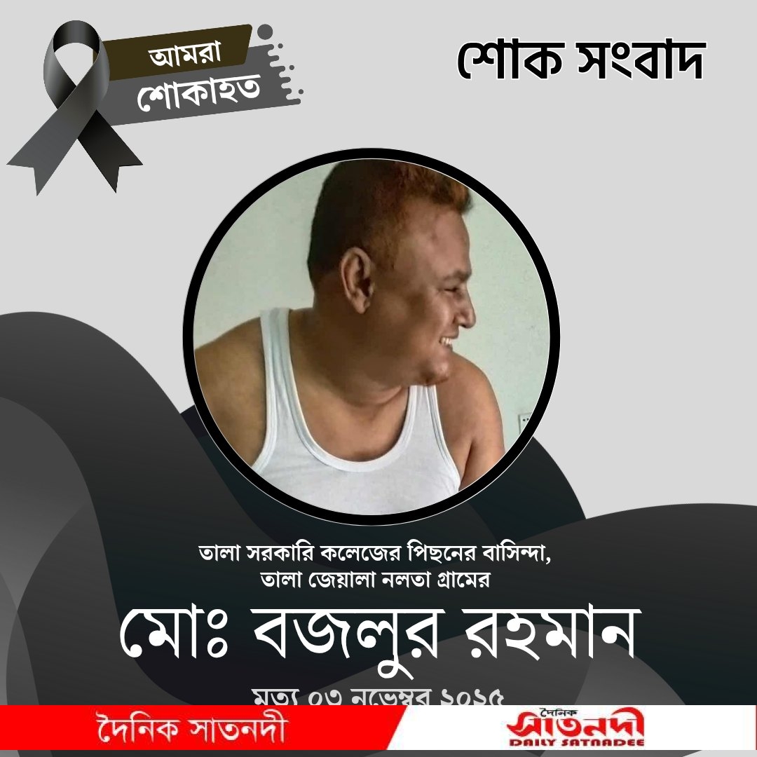 তালা অফিস থেকে নজরুল ইসলাম: তালায় বিশিষ্ট ঘের ব্যাবসায়ী মোঃ বজলুর রহমান শেখ (৫৬) এর মৃত্যু দাফন সম্পন্ন। গত ২ নভেম্বর রবিবার রাত্র ১০ টা দিকে বিনেপোতা নামক স্থানে তিনি আকস্কিক অসুস্থ্য হয়ে পড়েন। পরবর্তীতে গভীর রাতে সাতক্ষীরা মেডিকেল ও পরে খুলনা গাজী মেডিকেল কলেজ হাসপাতালে চিকিৎসা কালে গতকাল ৩ নভেম্বর মৃত্যু বরন করেন। তিনি মরহুম ইছারুদ্দীন শেখ এর পুত্র। তিনি মৃত্যুকালে স্ত্রী এক পুত্র এক কন্যা সন্তান রেখেযান। একমাত্র পুত্র সন্তান শেখ রাজু আহমেদ তুহিন (২৫)।