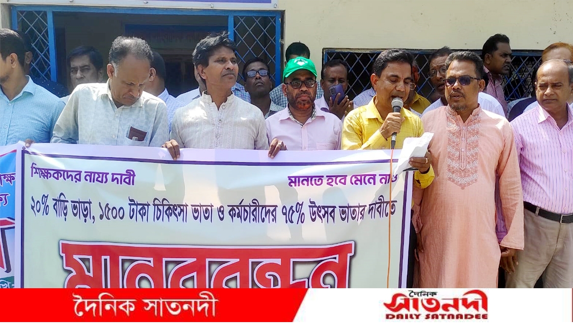 মানববন্ধনে বক্তারা বলেন, দেশের বেসরকারি শিক্ষকরা দীর্ঘদিন ধরে বৈষম্যের শিকার। বর্তমানে তারা মাত্র ১ হাজার টাকা বাড়িভাড়া ও ৫০০ টাকা চিকিৎসা ভাতা পান, যা বর্তমান বাজারমূল্য ও জীবনযাত্রার ব্যয়ের সঙ্গে সম্পূর্ণ অসামঞ্জস্যপূর্ণ। একজন সরকারি অফিস সহকারীর বেতনও এখন বেসরকারি শিক্ষকদের তুলনায় বহুগুণ বেশি, যা শিক্ষকদের মর্যাদা ও জীবনমানের সঙ্গে বেমানান। বক্তারা অবিলম্বে বেসরকারি শিক্ষকদের জন্য ২০% বাড়িভাড়া, ১,৫০০ টাকা চিকিৎসা ভাতা এবং ৭৫% উৎসব ভাতা বাস্তবায়নের জোর দাবি জানান। এছাড়া তারা ঢাকায় আন্দোলনরত শিক্ষকদের ওপর পুলিশি হামলার তীব্র নিন্দা ও প্রতিবাদ জানিয়ে দোষী আইনশৃঙ্খলা রক্ষাকারী বাহিনীর সদস্যদের দৃষ্টান্তমূলক শাস্তি দাবি করেন।