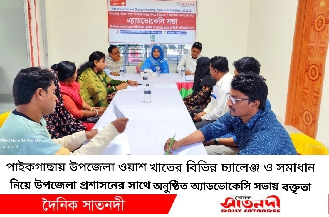 পাইকগাছা প্রতিবেদক: পাইকগাছা উপজেলায় ওয়াশ (পানি, স্যানিটেশন ও হাইজিন) খাতের বিভিন্ন চ্যালেঞ্জ ও সমাধান নিয়ে উপজেলা নির্বাহী অফিসার এবং উপজেলা প্রশাসনের সাথে একটি অ্যাডভোকেসি সভা অনুষ্ঠিত হয়েছে। হেলভেটাস সুইস ইন্টারকোঅপারেশন, বাংলাদেশ এর সহযোগীতায় এবং বেসরকারি উন্নয়ন সংস্থা ডরপ-এর আয়োজনে গতকাল সোমবার সকালে উপজেলা জনস্বাস্থ্য প্রকৌশলী অফিসের সভাকক্ষে এ সভা অনুষ্ঠিত হয়। সভায় প্রধান অতিথি ছিলেন উপজেলা নির্বাহী অফিসার মাহেরা নাজনীন। বিশেষ অতিথি ছিলেন উপজেলা মাধ্যমিক শিক্ষা কর্মকর্তা শাহজাহান আলী শেখ, জনস্বাস্থ্য উপসহকারী প্রকৌশলী প্রশান্ত পাল। সভার সভাপতিত্ব করেন ওয়াশ বাজেট মনিটরিং ক্লাবের সভাপতি জিএমএম আজাহারুল ইসলাম। সভায় স্বাগত বক্তৃতা করেন, ডরপ-এর উপজেলা সমন্বয়কারী ও কমিটির সদস্য সচিব মো. শরিফুল আলম তুহিন। অনুষ্ঠানে ওয়াশ বাজেট মনিটরিং ক্লাবের সদস্য, ইউপি সদস্য, সাংবাদিক এবং মা সংসদের প্রতিনিধিরা উপজেলা পর্যায়ে পাইকগাছার খাস পুকুর সমূহ ইজারা বাতিল করে জনসাধারণের পানির জন্য উন্মুক্ত করার, ওয়াশ ও জলবায়ু বাজেটে যথাযথ বরাদ্দ নিশ্চিত করার, কাঠিপাড়া বাজারে পাবলিক টয়লেট স্থাপন, চিনামলা এলাকার গুরুত্বপূর্ণ রাস্তা সংস্কার ও জলাবদ্ধতা নিরসনের দাবি জানানো সহ বিভিন্ন সমস্যা ও সমাধানের প্রস্তাবনা তুলে ধরেন। প্রধান অতিথির বক্তৃতা উপজেলা নির্বাহী অফিসার মাহেরা নাজনীন জানান, উপজেলায় রাজস্ব ও উন্নয়ন তহবিলের ১০% ওয়াশ খাতে বরাদ্দ রয়েছে, গত বছর গভীর নলকূপ স্থাপন এবং স্যানিটারি ন্যাপকিন বিতরণ করা হয়েছে, চলতি বছর খেয়া ঘাটে পাবলিক টয়লেট স্থাপন এবং ভেন্ডিং মেশিনের মাধ্যমে স্যানিটারি ন্যাপকিন কেনার ব্যবস্থা গ্রহণ করা হচ্ছে। জনসাধারণের ব্যবহারের জন্য খাস পুকুর সমূহ উন্মুক্ত করার লক্ষ্যে সংশ্লিষ্ট সকল পুকুরের তথ্য সংগ্রহের নির্দেশনা প্রদান করেন। কপিলমুনি ইউনিয়নের চিনামলা গ্রামের জলাবদ্ধতা নিরসন ও রাস্তা সংস্কারের ব্যবস্থা গ্রহণ করা হবে বলে নিশ্চিত করেন। সভায় ওয়াশ খাতের উন্নয়নে প্রশাসন, সিভিল সোসাইটি, বাজেট মনিটরিং ক্লাব ও ডরপ-এর সমন্বিত উদ্যোগ অব্যাহত রাখার প্রত্যয় ব্যক্ত করা হয়।