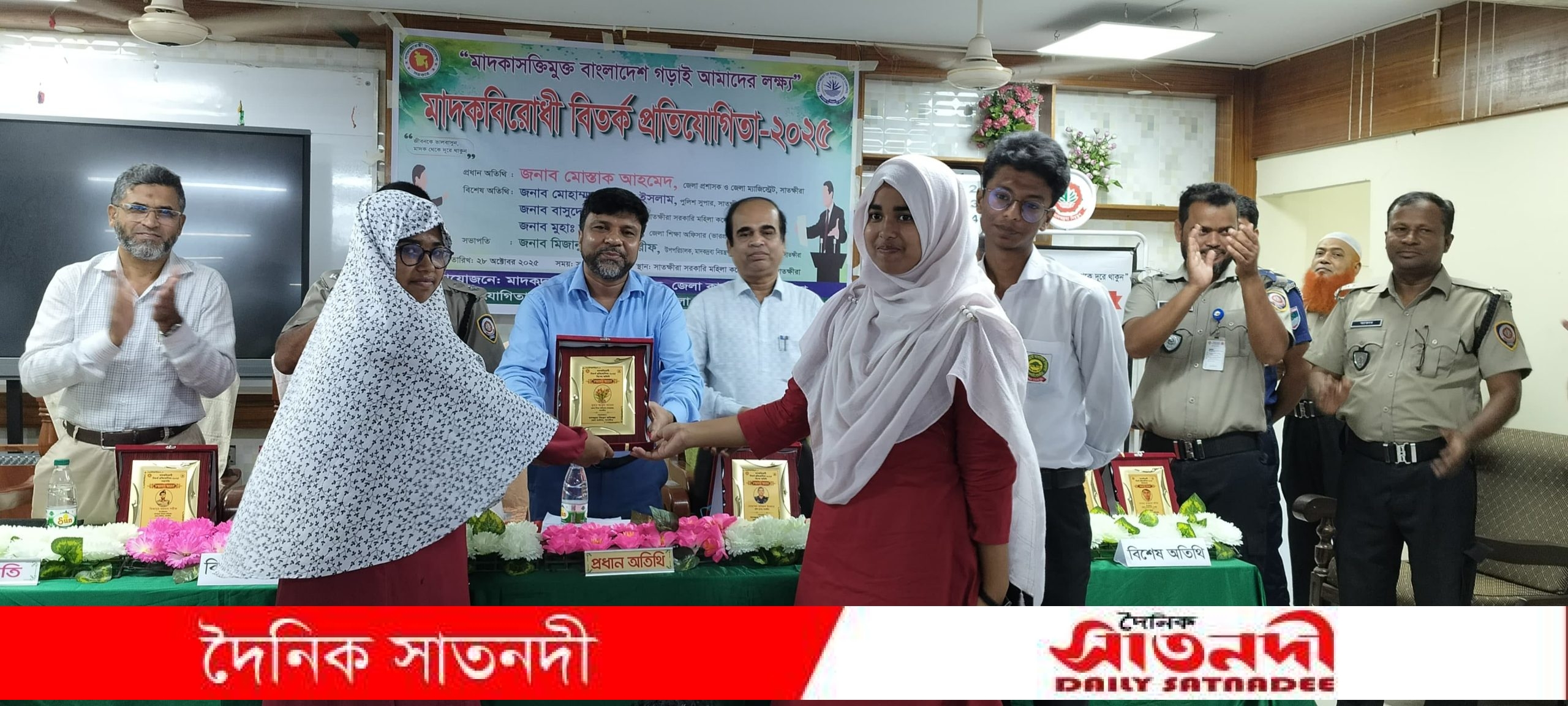 সাতক্ষীরা: মাদকদ্রব্য নিয়ন্ত্রণ অধিদপ্তর, সাতক্ষীরা জেলা কার্যালয়ের আয়োজনে অনুষ্ঠিত জেলা পর্যায়ের মাদকবিরোধী বিতর্ক প্রতিযোগিতায় চ্যাম্পিয়ন হয়েছে শ্যামনগর উপজেলার ছফিরুন্নেছা মাধ্যমিক বালিকা বিদ্যালয়। মঙ্গলবার (২৮ অক্টোবর ২০২৫) সকাল ১১টায় সাতক্ষীরা সরকারি মহিলা কলেজের অডিটোরিয়ামে অনুষ্ঠিত এ প্রতিযোগিতায় সভাপতিত্ব করেন মাদকদ্রব্য নিয়ন্ত্রণ অধিদপ্তর সাতক্ষীরা কার্যালয়ের উপ-পরিচালক মিজানুর রহমান শরীফ। অনুষ্ঠানে প্রধান অতিথি ছিলেন জেলা প্রশাসক ও জেলা ম্যাজিস্ট্রেট মোস্তাক আহমেদ। বিশেষ অতিথি হিসেবে উপস্থিত ছিলেন সাতক্ষীরা সরকারি মহিলা কলেজের অধ্যক্ষ প্রফেসর বাসুদেব বসু, উপাধ্যক্ষ প্রফেসর আবু হেনা মোস্তফা কামাল এবং জেলা মাধ্যমিক শিক্ষা অফিসার মাওলানা মুহা. আবুল খায়ের। বিতর্ক প্রতিযোগিতাটি সঞ্চালনা করেন জেলা দুর্নীতি প্রতিরোধ কমিটির সদস্য সাকিবুর রহমান বাবলা। বিচারক প্যানেলে ছিলেন সাতক্ষীরা আঞ্চলিক পাসপোর্ট অফিসের উপ-পরিচালক মুহা. আজমল কবির, জেলা শিশু বিষয়ক কর্মকর্তা মো. রিয়াজুল ইসলাম ও জেলা কালচারাল অফিসার ফাইজা হোসেন অন্বেষা। চার দলীয় এ প্রতিযোগিতায় অংশগ্রহণ করে সাতক্ষীরা সরকারি উচ্চ বিদ্যালয়, কলারোয়া পাইলট গার্লস মাধ্যমিক বিদ্যালয়, তালার কুমিরা বহুমুখী মাধ্যমিক বিদ্যালয় এবং শ্যামনগরের ছফিরুন্নেছা মাধ্যমিক বালিকা বিদ্যালয়। প্রথম পর্বে সাতক্ষীরা সরকারি উচ্চ বিদ্যালয়কে হারিয়ে কুমিরা বহুমুখী মাধ্যমিক বিদ্যালয় এবং কলারোয়া পাইলট গার্লস মাধ্যমিক বিদ্যালয়কে হারিয়ে ছফিরুন্নেছা মাধ্যমিক বালিকা বিদ্যালয় ফাইনালে ওঠে। শেষ পর্যন্ত কুমিরা বহুমুখী মাধ্যমিক বিদ্যালয়কে হারিয়ে চ্যাম্পিয়ন হয় শ্যামনগরের ছফিরুন্নেছা মাধ্যমিক বালিকা বিদ্যালয়। প্রতিযোগিতা শেষে চ্যাম্পিয়ন ও রানার্স-আপ দলকে পুরস্কৃত করা হয়। পাশাপাশি অতিথি, মডারেটর ও বিচারকদের সম্মাননা ক্রেস্ট প্রদান করা হয়। অনুষ্ঠানে উপস্থিত শিক্ষক-শিক্ষার্থীদের মধ্যে মাদকবিরোধী সচেতনতামূলক লিফলেট, ব্রোশিয়ার ও শিক্ষা সামগ্রী বিতরণ করা হয়।