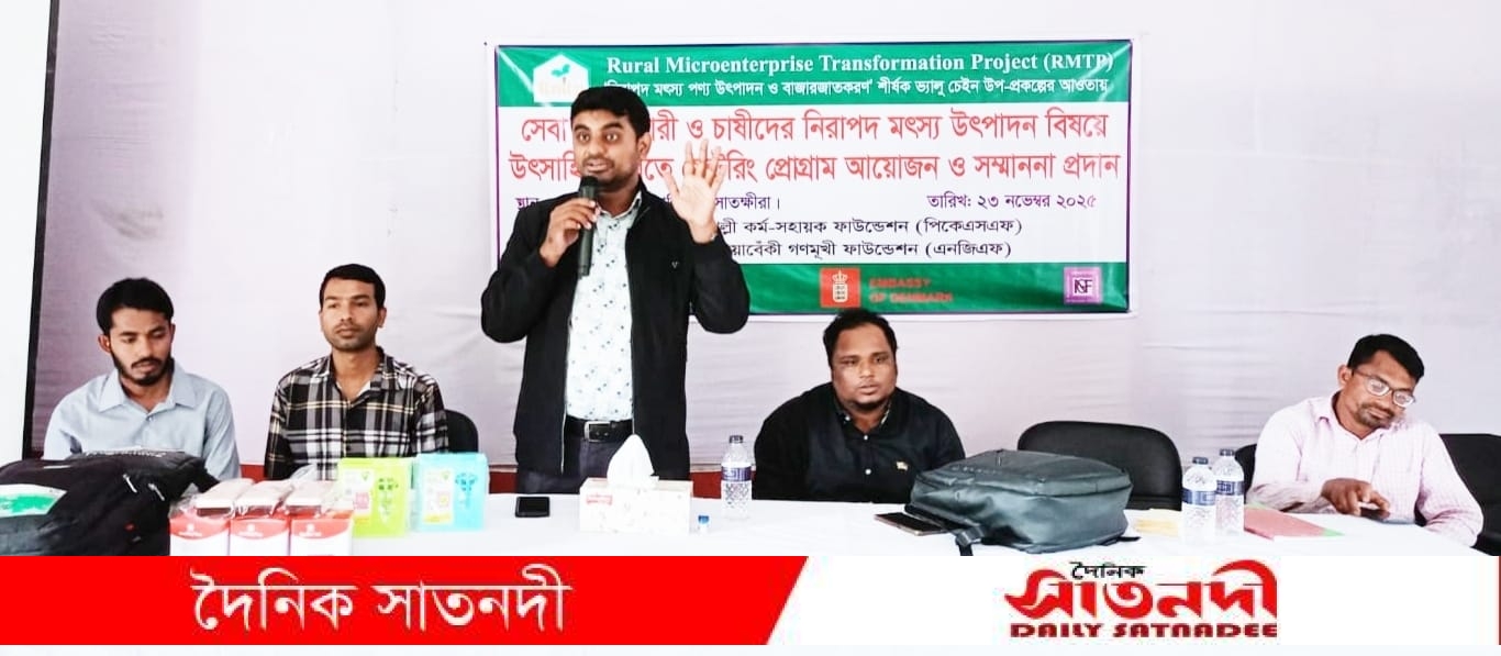 রবিবার (২৩ নভেম্বর) নওয়াবেকী গণমূখী ফাউন্ডেশন (এনজিএফ) এর আয়োজনে কালিগঞ্জ উপজেলা অফিসার্স ক্লাবে অনুষ্ঠিত Rural Microenterprise Transformation Project (RMTP) এর নিরাপদ মৎস্য পণ্য উৎপাদন ও বাজারজাতকরণ উপ-প্রকল্পের আওতায় শ্যামনগর, কালিগঞ্জ ও দেবহাটা উপজেলার বাছাইকৃত মৎস্য চাষী ও সেবা প্রদানকারীদের নিরাপদ মৎস্য উৎপাদন বিষয়ে উৎসাহিত করতে মেন্টরিং প্রোগ্রাম ও সম্মাননা প্রদান অনুষ্ঠানে প্রধান অতিথি হিসেবে উপস্থিত থেকে অনুষ্ঠানের উদ্বোধন ঘোষণা ও শুভেচ্ছা বক্তব্য প্রদান করেন কালিগঞ্জ উপজেলা সিনিয়র উপজেলা মৎস্য কর্মকর্তা তৌকির আহমেদ। এছাড়া উক্ত প্রশিক্ষণে উপস্থিত ছিলেন এনজিএফ কালিগঞ্জ শাখার শাখা ব্যবস্থাপক ইয়াছিন আলী, আরএমটিপি-এনজিএফ এর মনিটরিং ও ইভ্যালুয়েশন অফিসার ইউসুফ আলী এবং শ্যামনগর, কালিগঞ্জ ও দেবহাটা উপজেলার সহকারী ভ্যালু চেইন ফ্যাসিলিটেটরবৃন্দ। উক্ত অনুষ্ঠানে প্রকল্পের তিন উপজেলার নির্বাচিত চাষী ও সেবা প্রদানকারীদের সাথে নিরাপদ মাছ উৎপাদনের বিভিন্ন বিষয় নিয়ে আলোচনা করা হয় এবং উৎসাহিত ও সম্মাননা প্রদান করা হয়।