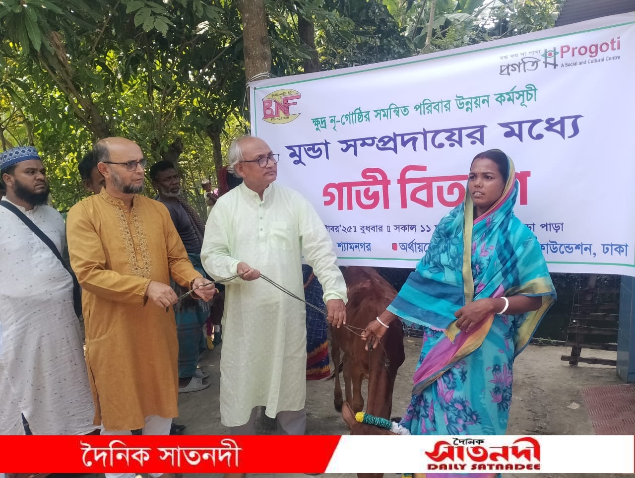 আব্রাহাম লিংকন শ্যামনগর থেকে: ১৫ ই অক্টোবর ( বুধবার ) সকাল ১১ টায় বাংলাদেশ এনজিও ফাউন্ডেশন , ঢাকার অর্থায়নে , প্রগতি , শ্যামনরের আয়োজনে শ্যামনগর উপজেলার রমজাননগর ইউনিয়নের ভেটখালীতে ক্ষুদ্র নৃ -গোষ্ঠির সমন্বিত পরিবার উন্নয়ন কর্মসূচী মুন্ডা সম্প্রদায়ের মধ্যে গাভী বিতরন করা হয়েছে। উক্ত গাভী বিতরণ অনুষ্ঠানে উপস্থিত ছিলেন শ্যামনগর উপজেলা জামায়াতে ইসলামীর আমির মোঃ আব্দুর রহমান , রমজাননগর ইউনিয়নের চেয়ারম্যান আলহাজ্ব শেখ আল মামুন , প্রগতির নির্বাহী পরিচালক আশেক এলাহি , শ্যামনগর উপজেলা উপসহকারী প্রাণি সম্পদ অফিসার সুদীপ্ত বিশ্বাস , সীমান্ত প্রেস কাবের সভাপতি মোঃ নূরুন্নবী ইসলাম ইমন , সাধারণ সম্পাদক জি,এম, আব্রাহাম লিংকনসহ সাংবাদিকবৃন্দ। উপকারভোগী ভেটখালী গ্রামের মনোতোষ কুমার মন্ডলের স্ত্রী প্রমিলা রানী মুন্ডা , পঞ্চানন মুন্ডার কন্যা মনোদীপা বালা মুন্ডা , ভটুক মুন্ডার কন্যা ফুলবাসী রানী মুন্ডা , স্বরুপ মুন্ডার কন্যা গিরিবালা মুন্ডা ,অসন্ত সরকারের স্ত্রী গঞ্চা দেবী , রামতনু মুন্ডার কন্যা পবিতা রাশী মুন্ডাকে উক্ত গাভী প্রদান করা হয়।
