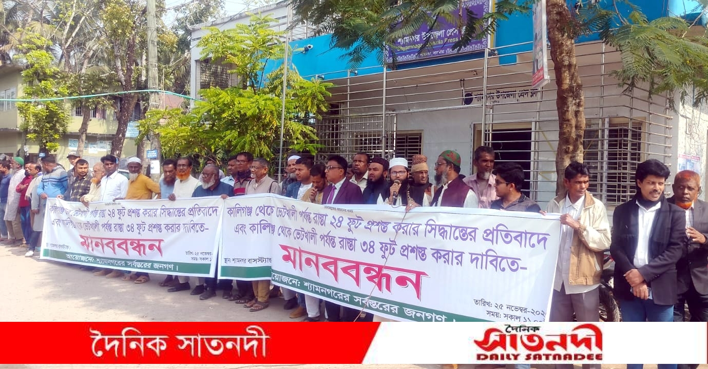 জিয়াউর রহমান শ্যামনগর থেকেঃ সাতক্ষীরার শ্যামনগরে সাতক্ষীরা হতে ভেটখালী পর্যন্ত মহাসড়ক ৩৪ ফিট প্রশস্ত করার দাবিতে এক মানববন্ধন অনুষ্ঠিত হয়েছে। মঙ্গলবার (২৫নভেম্বর) সকাল ১১টায় শ্যামনগর প্রেসক্লাবের সামনে শ্যামনগরের বিভিন্ন ইউনিয়ন হতে আগত সকল শ্রেণি পেশা মানুষ উপস্থিতিতে এ মানববন্ধন অনুষ্ঠিত হয়। অনুষ্ঠানে বক্তরা বলেন, শ্যামনগর মানুষ ইতিমধ্যে জানতে পেরেছে সাতক্ষীরা হইতে কালিগঞ্জ কাঁক শিয়ালী নদী ব্রিজ পর্যন্ত ৩৪ ফুট প্রশস্ত হবে। তারপর থেকে কালিগঞ্জ হতে ভেটখালী পর্যন্ত ২৪ ফুট প্রশস্ত হবে। এতে করে শ্যামনগর মানুষের প্রতি বৈষম্য করা হচ্ছে দাবি করে প্রতিবাদে শ্যামনগরের সর্বস্তরের পেশাজীবী মানুষরা আজকের এই মানববন্ধনে প্রতিবাদ জানান। তারা বলতে চাই শ্যামনগর হইতে বাংলাদেশের বিভিন্ন প্রান্তে এই মহাসড়ক দিয়ে বিভিন্ন ধরনের যানবাহন প্রতিনিয়ত চলাচল করে। শুধু তাই নয় সুন্দরবন পর্যটন কেন্দ্র ভ্রমনের জন্য বাংলাদেশের বিভিন্ন জায়গা হতে প্রতিদিন প্রায় হাজার হাজার ভ্রমনকারী পরিবহন, বাস, মিনিবাস, মাইক্রো সহ বিভিন্ন ধরনের শত শত যানবহনে যাতায়াত করে থাকে। মহাসড়কটির প্রশস্ত ৩৪ ফিটের স্থলে ২৪ ফিট হওয়ায় অত্যাধিক যানজট সৃষ্টি হবে। বক্তাদের বক্তব্য উঠে আসে শ্যামনগরের বুকে অবস্থিত শ্যামনগর সরকারি মহসিন কলেজ, শ্যামনগর আতরজান কলেজ, শ্যামনগরে সরকারি পাইলট হাই স্কুল, ম্যানেগ্রোভ সুন্দরবন ও ভৌগলিক দিক দিয়ে বাংলাদেশের সর্ববৃহৎ উপজেলা শ্যামনগর। শ্যামনগরের সাদা সোনা, বাগদা চিংড়ী সহ হরেক রকমের মৎস্য ও কাঁকড়া এই সড়ক দিয়ে দেশের বিভিন্ন স্থানে রফতানি ও বিভিন্ন দেশে রফতানি হয়ে থাকে। শ্যামনগরের সর্বস্তরের মানুষের প্রাণের দাবি এই মহাসড়কটি ৩৪ ফিট প্রশস্ত করতে হবে। তা না হলে আমাদের আন্দোলন চলমান থাকবে।