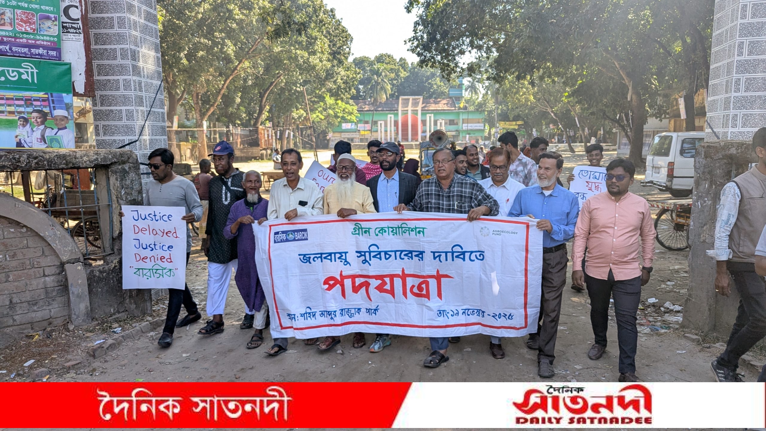 বুধবার (১৯ নভেম্বর) সাতক্ষীরা শহরের শহীদ আব্দুর রাজ্জাক পার্ক থেকে গ্রীন কোয়ালিশন, গবেষণা প্রতিষ্ঠান বারসিক এবং শিক্ষা সংস্কৃতি ও বৈচিত্র্য রক্ষা টিমের যৌথ উদ্যোগে এই পদযাত্রা বের হয়। পদযাত্রাটি বিভিন্ন সড়ক প্রদক্ষিণ করে পুনরায় একই স্থানে ফিরে আসে।