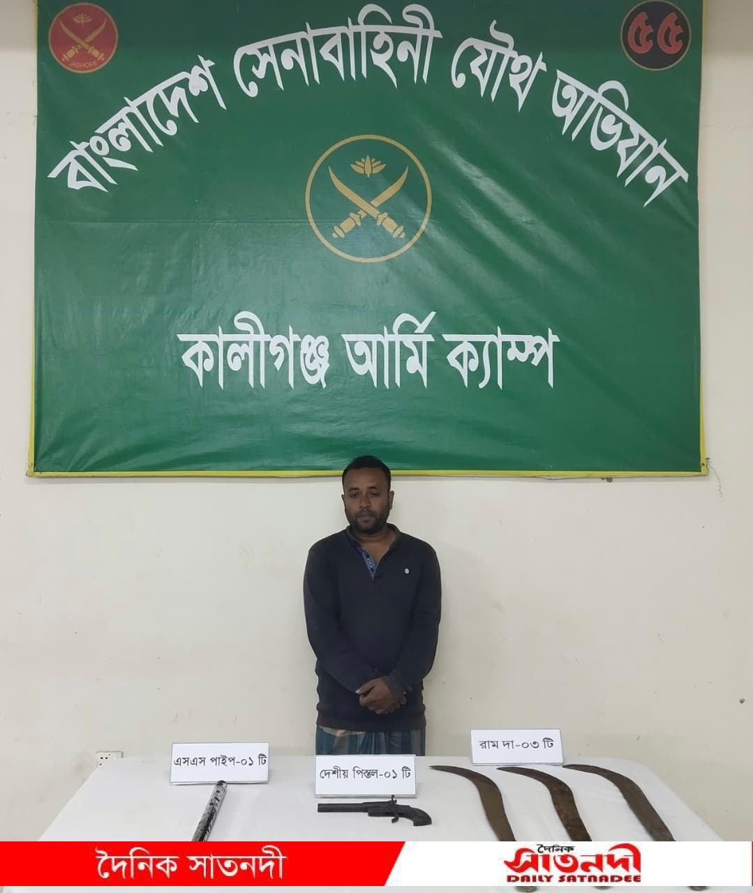কালিগঞ্জ সেনা ক্যাম্প জানায়, শ্যামনগরের নিদয়া গ্রামের হাবিবুর রহমান নামক একজন সন্ত্রাসী আগ্নেয়াস্ত্র এবং দেশীয় অস্ত্রসহ নিজ বাসায় অবস্থান করছে এমন গোপন সংবাদের ভিত্তিতে কালিগঞ্জ সেনা ক্যাম্প এবং ১৭ বিজিবির যৌথ অভিযানে তাকে আটক করা হয়। এসময় হাবিবুরের নিজ বাসস্থানের সামনে রাখা ধানের গোলার ভিতর থেকে একটি দেশীয় আগ্নেয়াস্ত্র এবং বাসস্থানের ভেতর থেকে বিভিন্ন দেশীয় ধারালো অস্ত্র উদ্ধার করা হয়।