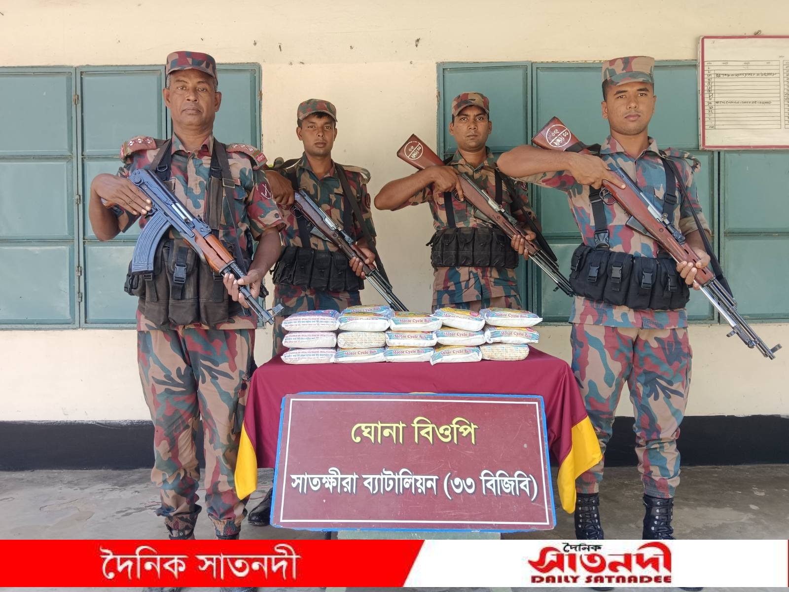 গোয়েন্দা তথ্যের ভিত্তিতে ভোমরা বিওপির এর আভিযানিক দল মেইন পিলার-৩ হতে ৫০০ গজ বাংলাদেশের অভ্যন্তরে সাতক্ষীরা সদর থানাধীন ফলমোড় নামক স্থান হতে ৬,৯০০/- ভারতীয় প্রেসার কুকার আটক করে। ঘোন বিওপির এর আভিযানিক দল মেইন পিলার-৬/৫ এস হতে ২০০ গজ বাংলাদেশের অভ্যন্তরে সাতক্ষীরা সদর থানাধীন পায়রাডাঙ্গা আমাবাগন নামক স্থান হতে ৮,২০০/- ভারতীয় বিড়ি আটক করে। তলুইগাছা বিওপির এর আভিযানিক দল মেইন পিলার-১৩/৩ এস এর ৩ আরবি হতে বাংলাদেশের অভ্যন্তরে সাতক্ষীরা সদর থানাধীন মুজুরদারের খাল নামক স্থান হতে ৪৫,০০০/- টাকা মূল্যের ভারতীয় ঔষধী গাছের বাকল আটক করে। মাদরা বিওপির বিশেষ আভিযানিক দল সীমান্ত পিলার-১৩/৩ এস এর ৮ আরবি হতে আনুমানিক ৪০০ গজ বাংলাদেশের অভ্যন্তরে কলারোয়া থানাধীন চান্দা নামক স্থান হতে ৩৫,০০০/- টাকা মূল্যের ভারতীয় শাড়ি আটক করে। হিজলদী বিওপির বিশেষ আভিযানিক দল সীমান্ত পিলার-১৩/৪ এস হতে আনুমানিক ৩০০ গজ বাংলাদেশের অভ্যন্তরে কলারোয়া থানাধীন শিশুতলা নামক স্থান হতে ২,১০,০০০/- টাকা মূল্যের ভারতীয় ঔষধ আটক করে। এছাড়াও, ঝাউডাঙ্গা বিশেষ ক্যাম্পের বিশেষ আভিযানিক দল বাংলাদেশের অভ্যন্তরে সাতক্ষীরা থানাধীন হরিণা নামক স্থান হতে ৩০,০০০/- টাকা মূল্যের ২০ বোতল ভারতীয় মদ আটক করে।