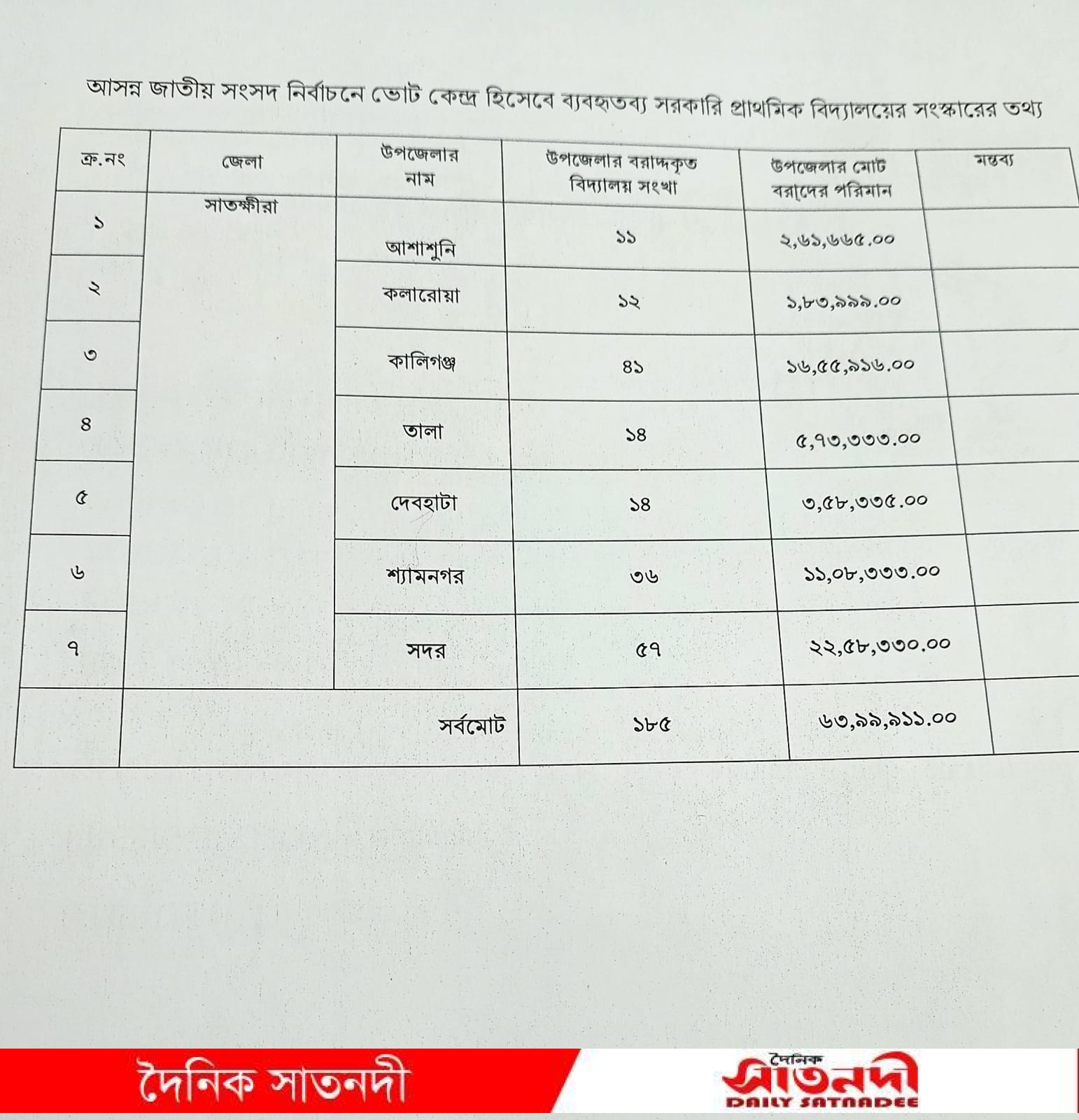 আব্দুর রহমান: আসন্ন জাতীয় সংসদ নির্বাচনকে সামনে রেখে ভোটকেন্দ্র হিসেবে ব্যবহৃত হবে সাতক্ষীরা জেলার ১৮৫টি সরকারি প্রাথমিক বিদ্যালয়। এসব বিদ্যালয়ের জরুরি মেরামত ও সংস্কারের জন্য প্রাথমিক শিক্ষা অধিদপ্তর থেকে বরাদ্দ দেওয়া হয়েছে ৬৩ লাখ ৯৯ হাজার ৯১১ টাকা। চলতি সপ্তাহে প্রাথমিক ও গণশিক্ষা মন্ত্রণালয় থেকে জারি করা এক স্মারকে এই বরাদ্দের বিষয়টি জানানো হয়েছে। এতে উপজেলা পর্যায়ের প্রাথমিক শিক্ষা কর্মকর্তাদের এই অর্থ উত্তোলন ও ব্যয়ের ক্ষমতা প্রদান করা হয়েছে। স্মারকে বলা হয়, ২০২৫-২৬ অর্থবছরের পরিচালন বাজেটের ‘অন্যান্য ভবন ও স্থাপনা’ খাতের আওতায় সারাদেশে ১২ হাজার ৫৩১টি সরকারি প্রাথমিক বিদ্যালয়ের সংস্কারের জন্য মোট ৪১ কোটি ১২ লাখ টাকা বরাদ্দ দেওয়া হয়েছে। এ অর্থ এসেছে একই খাতের মোট ৮০ কোটি টাকার বরাদ্দ থেকে। স্মারকে অর্থ ব্যয়ের ক্ষেত্রে বেশ কয়েকটি কঠোর শর্ত আরোপ করা হয়েছে। এর মধ্যে রয়েছে- সরকারের সব আর্থিক বিধি-বিধান অনুসরণ করতে হবে। ভ্যাট পরিশোধের প্রমাণপত্র সংরক্ষণ বাধ্যতামূলক। অডিটের জন্য সব বিল-ভাউচার সংরক্ষণ করতে হবে। নির্ধারিত সময়ের মধ্যে মানসম্মতভাবে কাজ সম্পন্ন করতে হবে। কাজ সম্পন্নে ব্যর্থ হলে উপজেলা প্রাথমিক শিক্ষা কর্মকর্তা, বিদ্যালয়ের প্রধান শিক্ষক ও স্কুল ম্যানেজমেন্ট কমিটির সদস্যদের দায়ী করা হবে। অব্যয়িত অর্থ ৩০ জুন ২০২৬-এর মধ্যে সরকারি কোষাগারে জমা দিতে হবে। সংস্কারকাজ তদারকি করবেন বিভাগীয় উপপরিচালক (প্রাথমিক শিক্ষা), জেলা প্রাথমিক শিক্ষা অফিসার, উপজেলা নির্বাহী কর্মকর্তা (ইউএনও) এবং উপজেলা প্রকৌশলী (এলজিইডি)। মন্ত্রণালয় জানায়, নির্বাচনের আগেই ভোটকেন্দ্রগুলোর সংস্কার কাজ মানসম্মতভাবে শেষ করার জন্য মাঠপর্যায়ে নির্দেশনা পাঠানো হয়েছে।