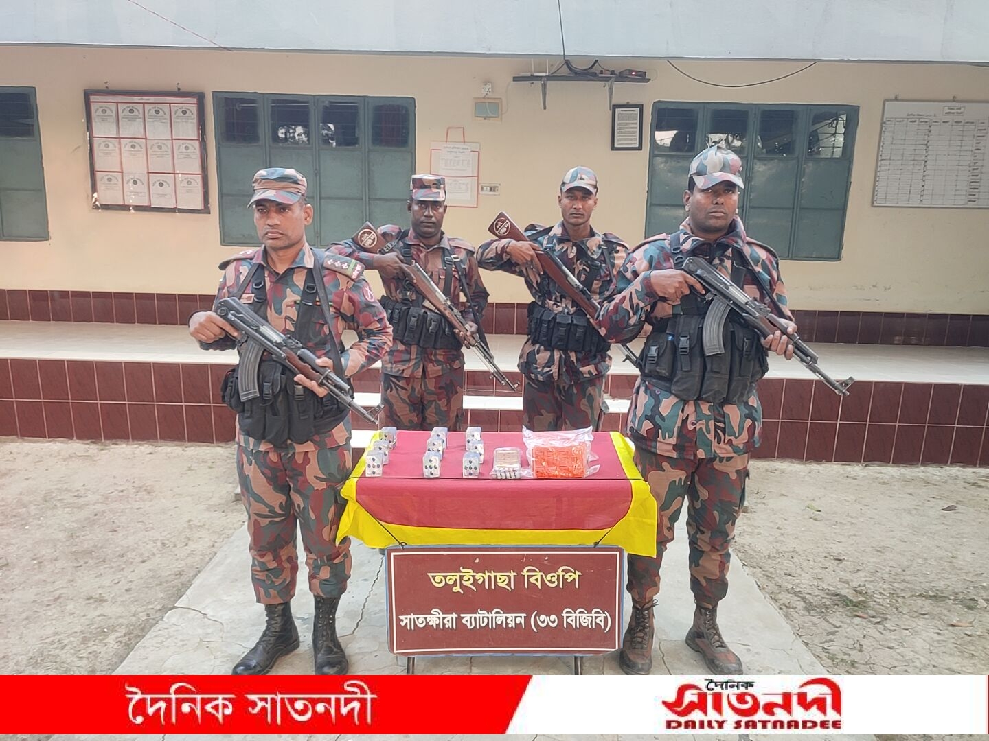অদ্য ০৭ জানুয়ারি ২০২৬ তারিখ সাতক্ষীরা ব্যাটালিয়ন (৩৩ বিজিবি) এর অধীনস্থ তলুইগাছা, কাকডাঙ্গা, মাদরা, চান্দুরিয়া বিওপি এবং বাঁকাল চেকপোষ্ট এর দায়িত্বপূর্ণ এলাকায় মাদক বিরোধী বিশেষ অভিযান পরিচালনা করে ০২ বোতল ভারতীয় মদসহ প্রায় সাড়ে পাঁচ লক্ষ টাকার ঔষধ ও শাড়ি আটক করে।