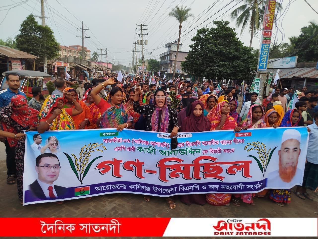 স্টাফ রিপোর্টার: সাতক্ষীরা ৩ আসনের ধানের শীষের সংসদ সদস্য প্রার্থী কাজী আলাউদ্দিনকে বিজয়ী করার লক্ষে গন মিছিল অনুষ্টিত হয়েছে। বৃহস্পতিবার বিকালে কালীগঞ্জ কলেজ মোড় থেকে মিছিলটি বের হয়ে গুরুত্বপূর্ণ সড়ক প্রদক্ষিণ করে শেষ হয়।
